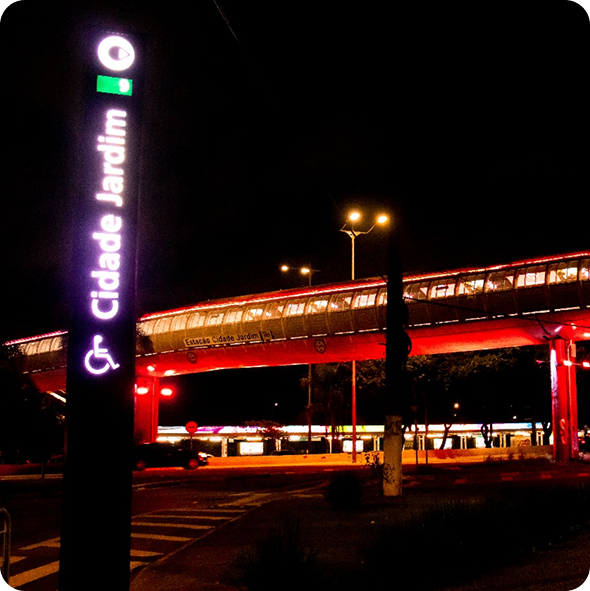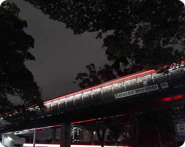 Serviços Realizados: Projeto Luminotécnico, Projeto Elétrico, Fornecimento de Luminárias, Instalação Elétrica, Automação e Instalações em Fachada e Passarela.