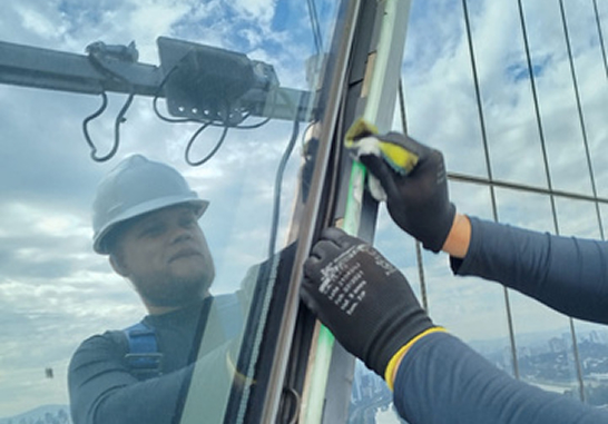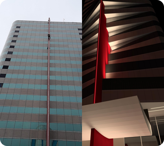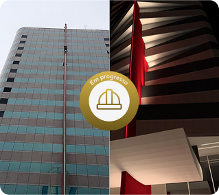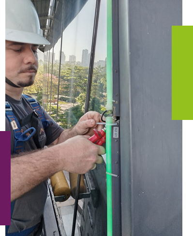 seja através de uma equipe altamente preparada para subir em edifícios com mais de 100 metros de altura, seja em relação a equipamentos de acesso confiáveis operados por técnicos qualificados.